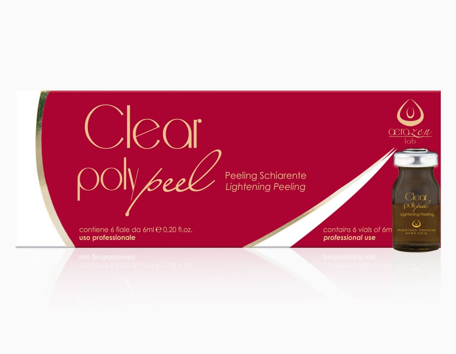 O Clear Poly Peel é um peeling branqueador formulado de forma a criar uma sinergia entre os ácidos misturados, garantindo que cada propriedade específica pode ser interligada numa rede de trabalho multifuncional. As atividades esfoliantes e hidratantes dos ácidos glicólico e láctico estiveram associadas às ações iluminadoras e despigmentantes da Aburtina, um glicosídeo extraído da planta uva-ursina do género Arctostaphylos, que bloqueia a atividade enzimática da tirosinase, inibindo a produção de melanina, responsável pelo escurecimento da pele e pela formação de manchas. A ação branqueadora é também promovida pelo ácido azelaico e pelo ácido salicílico, que combinam uma ação queratolítica, anti-inflamatória e bacteriostática.